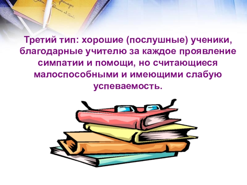 Слайд 49Третий тип: хорошие (послушные) ученики, благодарные учителю за каждое проявление симпатии