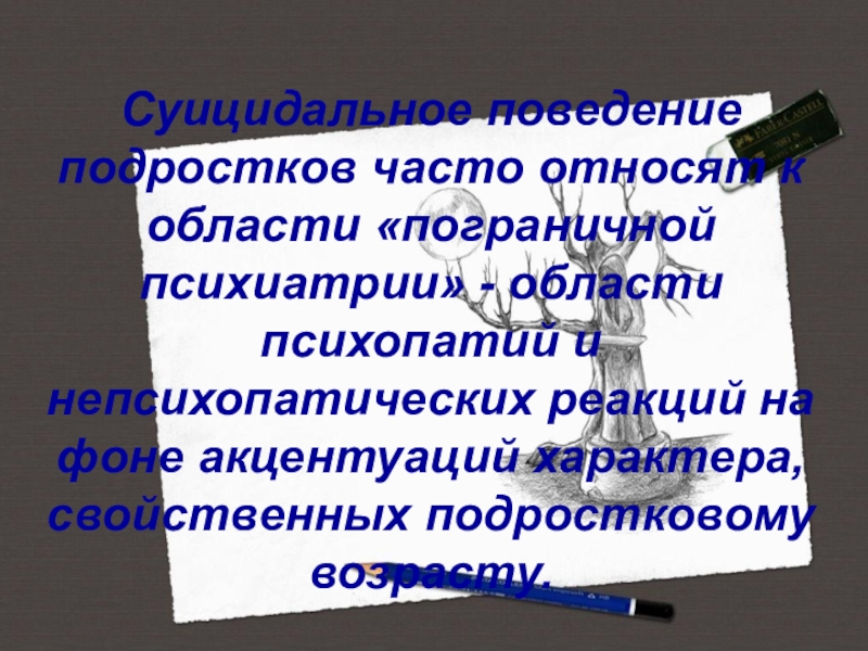 Слайд 152Суицидальное поведение подростков часто относят к области «пограничной психиатрии» - области
