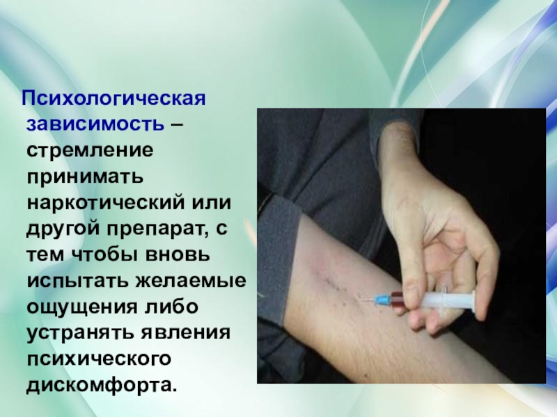 Слайд 132 Психологическая зависимость – стремление принимать наркотический или другой препарат,