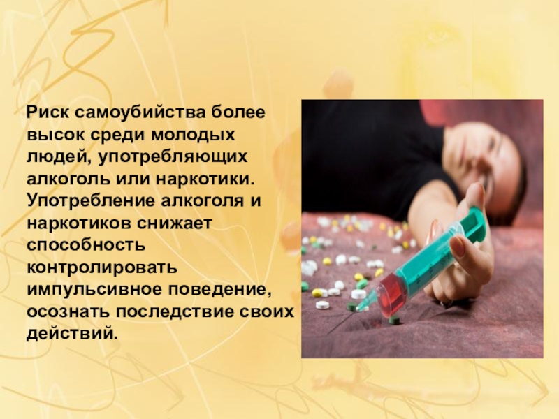 Слайд 161 Риск самоубийства более высок среди молодых людей, употребляющих алкоголь