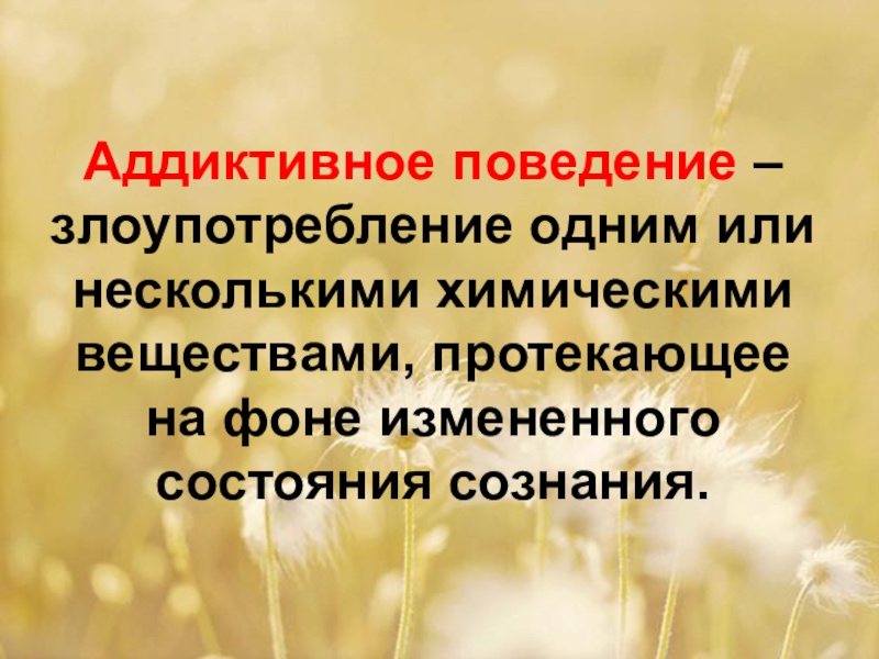 Слайд 128Аддиктивное поведение – злоупотребление одним или несколькими химическими веществами, протекающее на