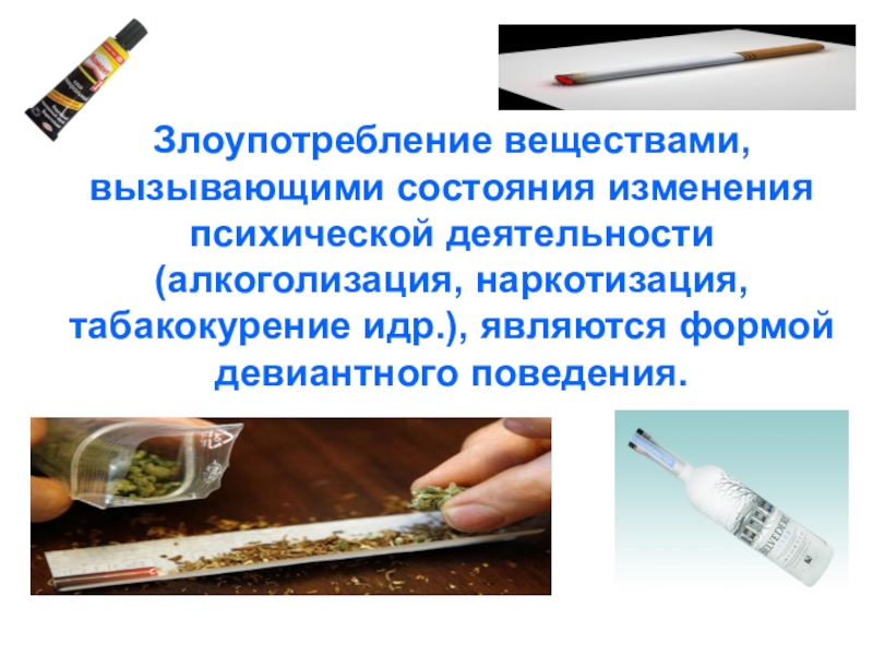 Слайд 129Злоупотребление веществами, вызывающими состояния изменения психической деятельности (алкоголизация, наркотизация, табакокурение идр.),