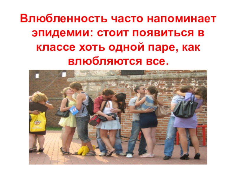 Слайд 113Влюбленность часто напоминает эпидемии: стоит появиться в классе хоть одной паре,