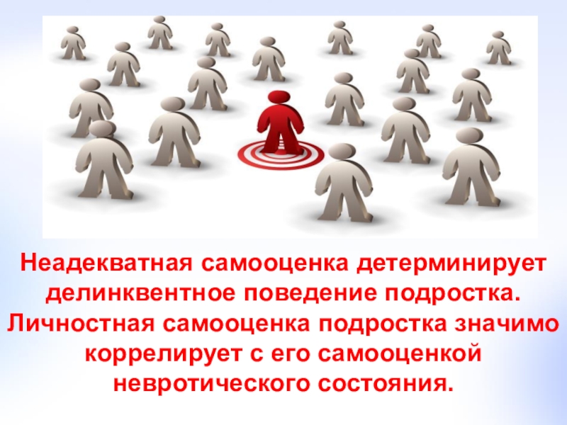 Слайд 34Неадекватная самооценка детерминирует делинквентное поведение подростка. Личностная самооценка подростка значимо коррелирует