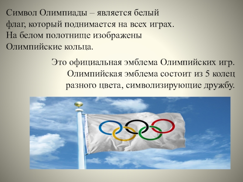 Олимпийская эмблема состоит из 5 колец разного цвета, символизирующие дружбу.