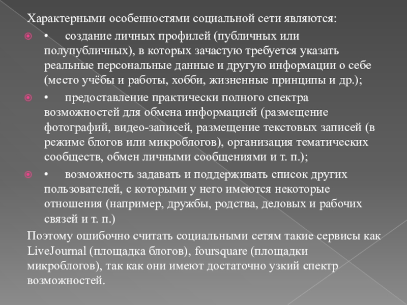 Поэтому ошибочно считать социальными сетям такие сервисы как LiveJournal (площадка блогов), foursquare (площадки микроблогов), так как они имеют достаточно узкий спектр возможностей.