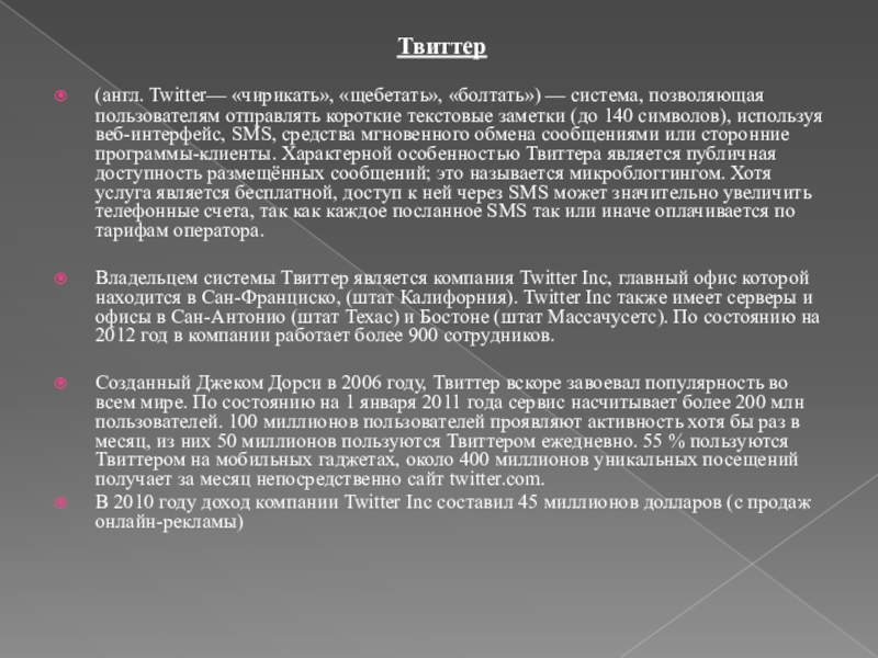 Созданный Джеком Дорси в 2006 году, Твиттер вскоре завоевал популярность во всем мире. По состоянию на 1 января 2011 года сервис насчитывает более 200 млн пользователей. 100 миллионов пользователей проявляют активность хотя бы раз в месяц, из них 50 миллионов пользуются Твиттером ежедневно. 55 % пользуются Твиттером на мобильных гаджетах, около 400 миллионов уникальных посещений получает за месяц непосредственно сайт twitter.com.