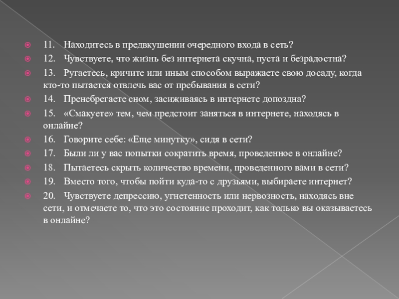 20. Чувствуете депрессию, угнетенность или нервозность, находясь вне сети, и отмечаете то, что это состояние проходит, как только вы оказываетесь в онлайне?
