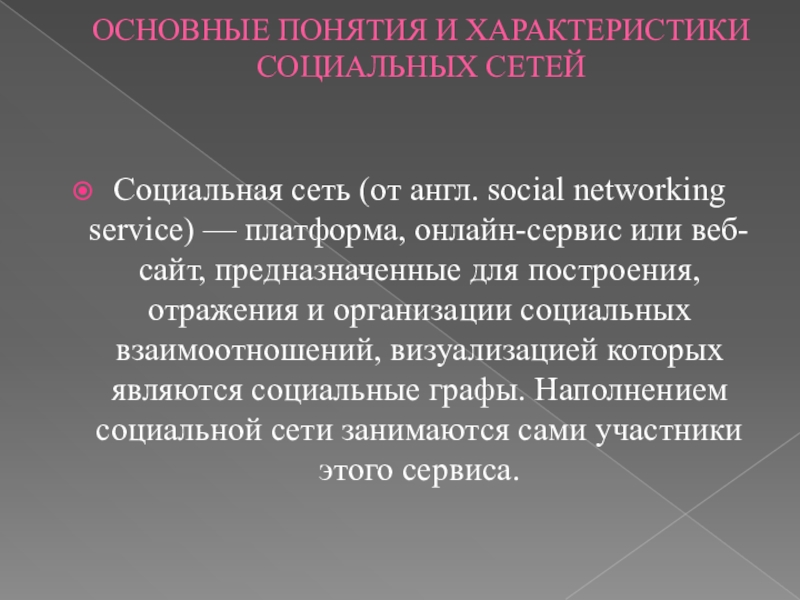 Слайд 20ОСНОВНЫЕ ПОНЯТИЯ И ХАРАКТЕРИСТИКИ СОЦИАЛЬНЫХ СЕТЕЙ