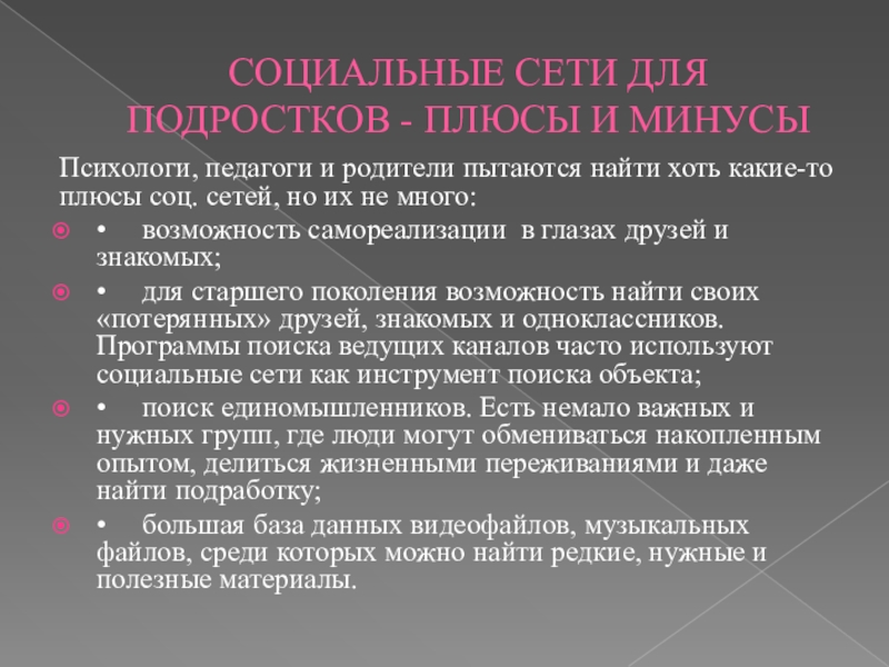 Слайд 6СОЦИАЛЬНЫЕ СЕТИ ДЛЯ ПОДРОСТКОВ - ПЛЮСЫ И МИНУСЫ