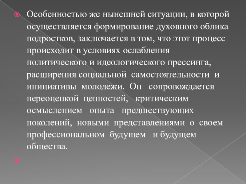 Слайд 3Особенностью же нынешней ситуации, в которой осуществляется формирование духовного облика подростков,