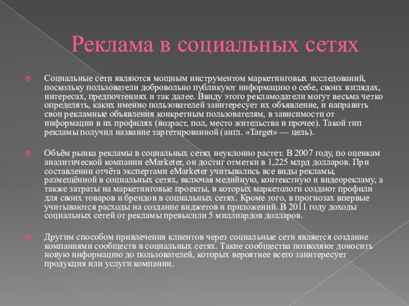 пользователи добровольно публикуют информацию о себе, своих взглядах, интересах, предпочтениях и так далее. Ввиду этого рекламодатели могут весьма четко определять, каких именно пользователей заинтересует их объявление, и направить свои рекламные объявления конкретным пользователям, в зависимости от информации в их профилях (возраст, пол, место жительства и прочее). Такой тип рекламы получил название таргетированной (англ. «Target» — цель).