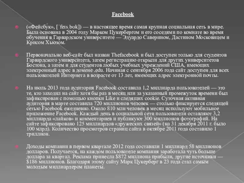 мире. Была основана в 2004 году Марком Цукербергом и его соседями по комнате во время обучения в Гарвардском университете — Эдуардо Саверином, Дастином Московицем и Крисом Хьюзом.