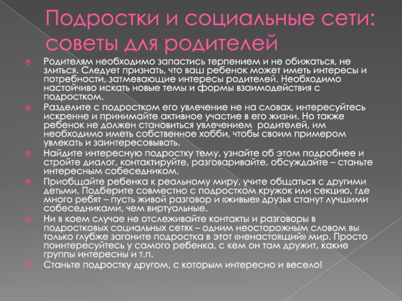 Ни в коем случае не отслеживайте контакты и разговоры в подростковых социальных сетях – одним неосторожным словом вы только глубже загоните подростка в этот «ненастоящий» мир. Просто поинтересуйтесь у самого ребенка, с кем он там дружит, какие группы интересны и т.п.