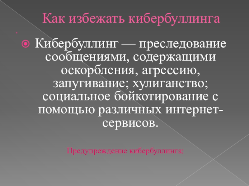 Кибербуллинг — преследование сообщениями, содержащими оскорбления, агрессию, запугивание;