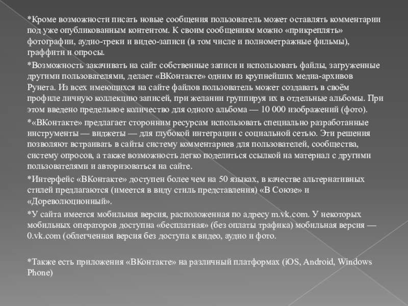 Слайд 25*Кроме возможности писать новые сообщения пользователь может оставлять комментарии под уже