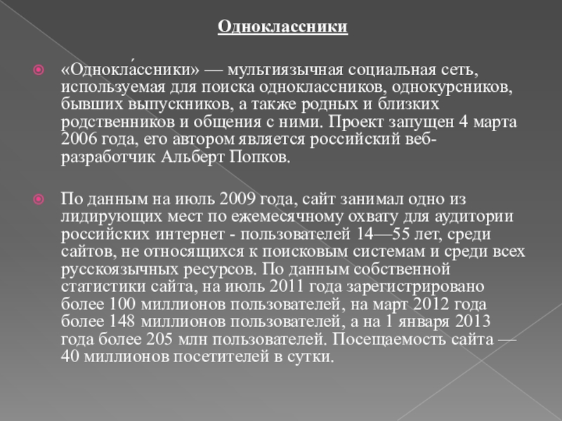 выпускников, а также родных и близких родственников и общения с ними. Проект запущен 4 марта 2006 года, его автором является российский веб-разработчик Альберт Попков.