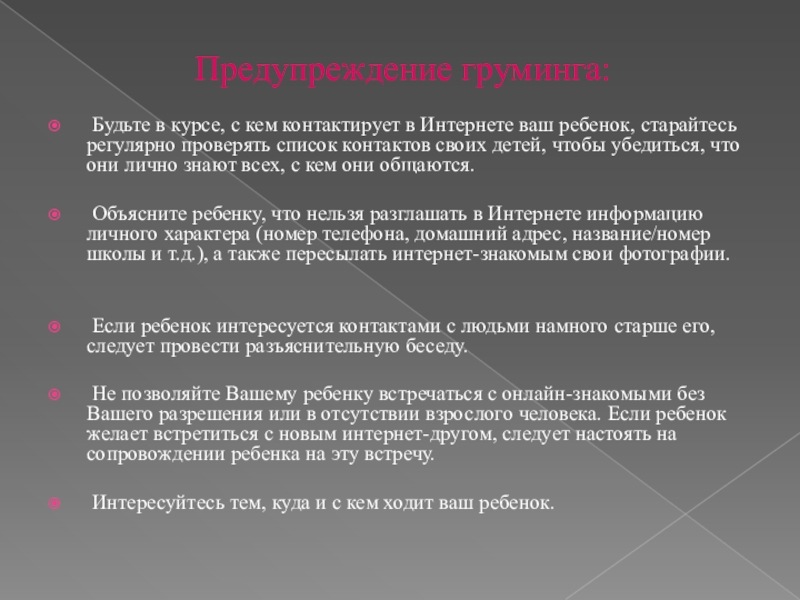 Не позволяйте Вашему ребенку встречаться с онлайн-знакомыми без Вашего разрешения или в отсутствии взрослого человека. Если ребенок желает встретиться с новым интернет-другом, следует настоять на сопровождении ребенка на эту встречу.