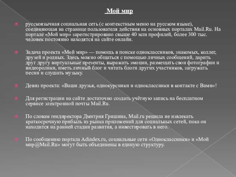 соединяющая на странице пользователя действия на основных порталах Mail.Ru. На портале «Мой мир» зарегистрировано свыше 40 млн профилей, более 300 тыс. человек постоянно находятся на сайте онлайн.