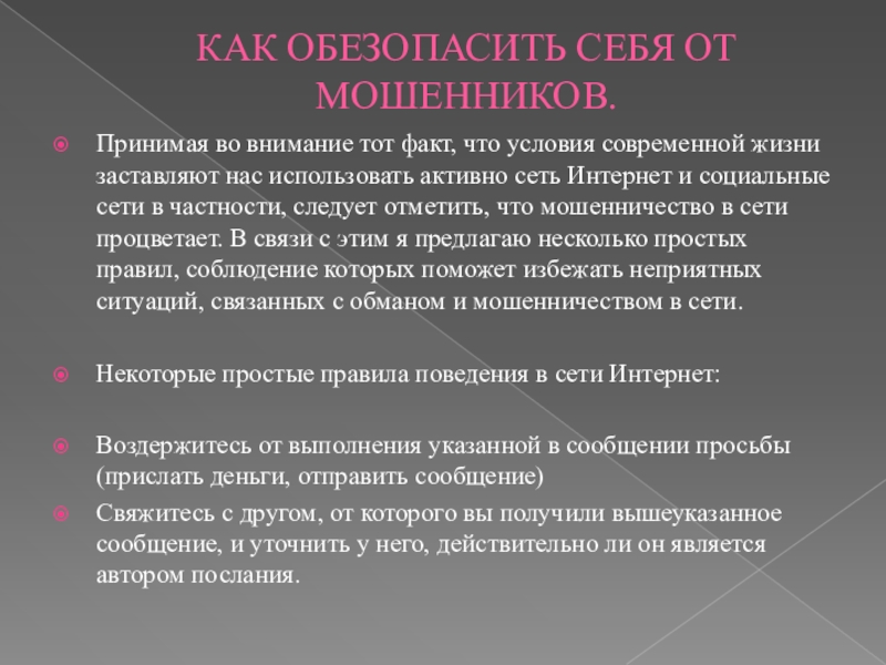 современной жизни заставляют нас использовать активно сеть Интернет и социальные сети в частности, следует отметить, что мошенничество в сети процветает. В связи с этим я предлагаю несколько простых правил, соблюдение которых поможет избежать неприятных ситуаций, связанных с обманом и мошенничеством в сети.