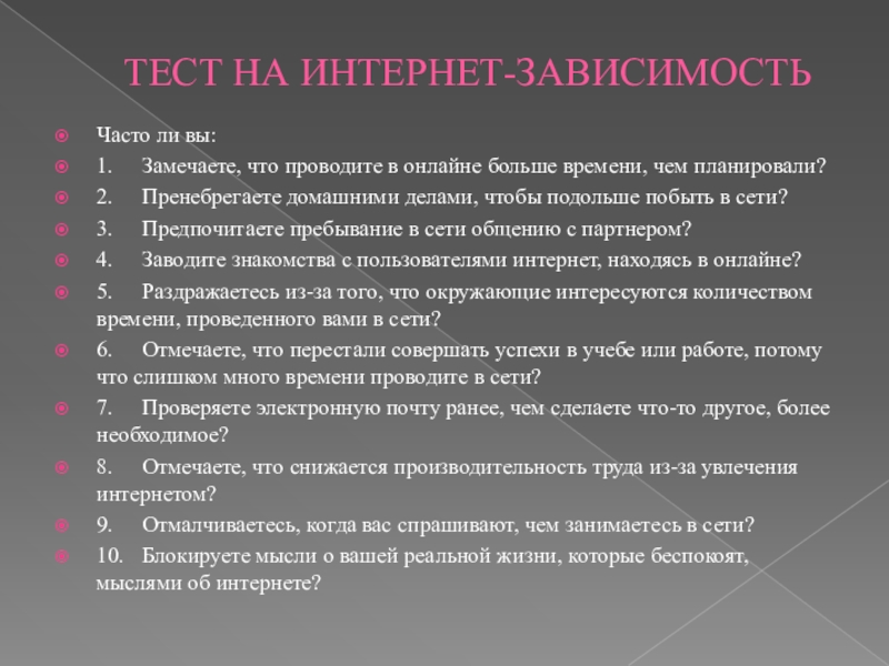 Слайд 12ТЕСТ НА ИНТЕРНЕТ-ЗАВИСИМОСТЬ