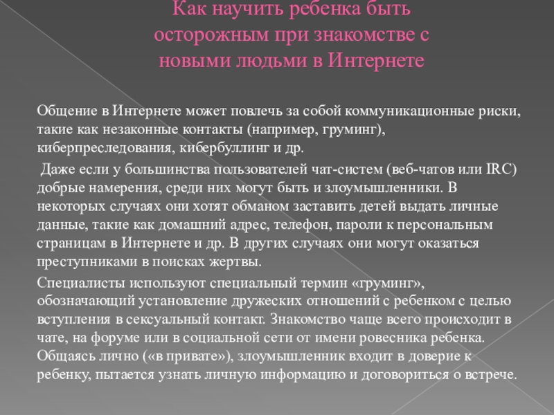 Даже если у большинства пользователей чат-систем (веб-чатов или IRC) добрые намерения, среди них могут быть и злоумышленники. В некоторых случаях они хотят обманом заставить детей выдать личные данные, такие как домашний адрес, телефон, пароли к персональным страницам в Интернете и др. В других случаях они могут оказаться преступниками в поисках жертвы.