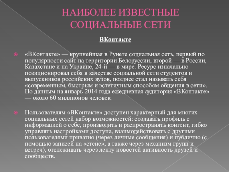 по популярности сайт на территории Белоруссии, второй — в России, Казахстане и на Украине, 24-й — в мире. Ресурс изначально позиционировал себя в качестве социальной сети студентов и выпускников российских вузов, позднее стал называть себя «современным, быстрым и эстетичным способом общения в сети». По данным на январь 2014 года ежедневная аудитория «ВКонтакте» — около 60 миллионов человек.