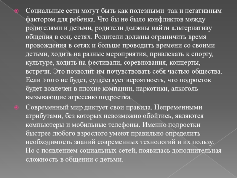 ребенка. Что бы не было конфликтов между родителями и детьми, родители должны найти альтернативу общения в соц. сетях. Родители должны ограничить время провождения в сетях и больше проводить времени со своими детьми, ходить на разные мероприятия, привлекать к спорту, культуре, ходить на фестивали, соревнования, концерты, встречи. Это позволит им почувствовать себя частью общества. Если этого не будет, существует вероятность, что подросток будет вовлечен в плохие компании, наркотики, алкоголь вызывающие агрессию подростка.