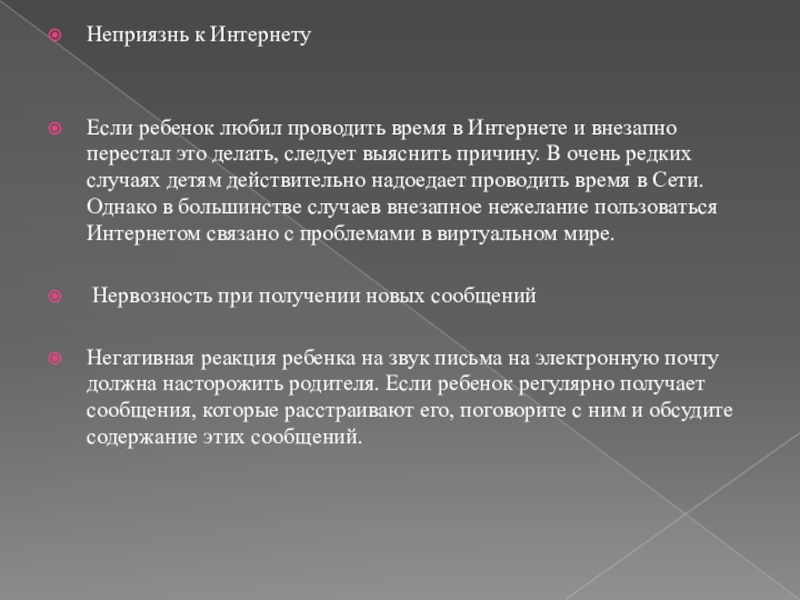 Негативная реакция ребенка на звук письма на электронную почту должна насторожить родителя. Если ребенок регулярно получает сообщения, которые расстраивают его, поговорите с ним и обсудите содержание этих сообщений.