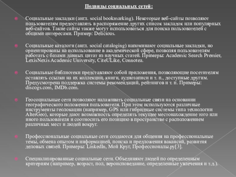предоставлять в распоряжение других список закладок или популярных веб-сайтов. Такие сайты также могут использоваться для поиска пользователей с общими интересами. Пример: Delicious.