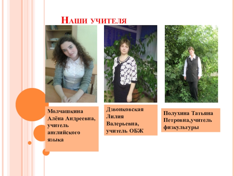 Наши учителяМолчашкина Алёна Андреевна, учитель английского языкаДзвонковская Лилия Валерьевна,учитель ОБЖПолухина Татьяна Петровна,учитель физкультуры
