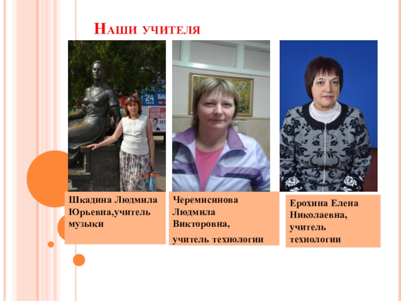 Наши учителяЧеремисинова Людмила Викторовна,учитель технологииШкадина Людмила Юрьевна,учитель музыкиЕрохина Елена Николаевна, учитель технологии