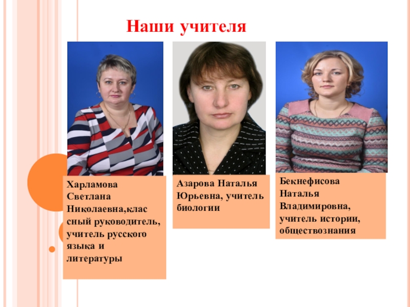 Наши учителяАзарова Наталья Юрьевна, учитель биологииБекнефисова Наталья Владимировна,учитель истории, обществознанияХарламова Светлана Николаевна,классный руководитель,учитель русского языка и литературы