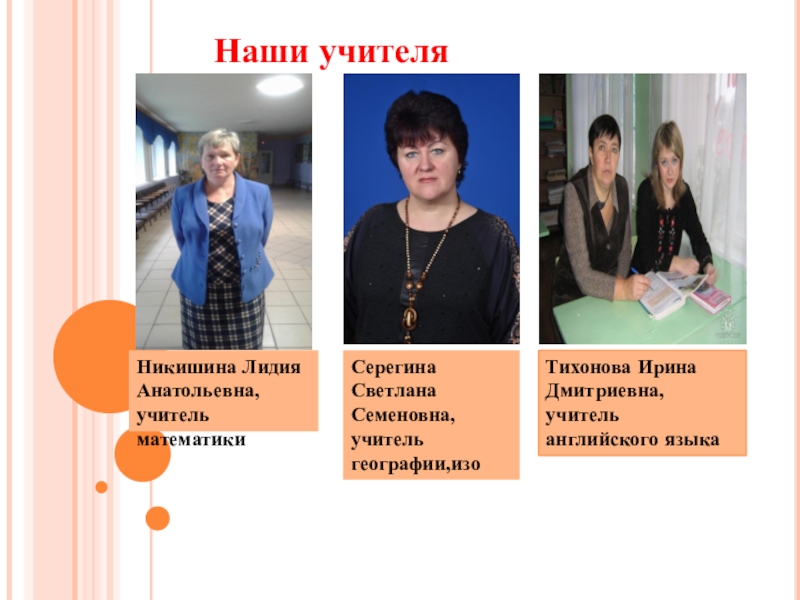 Наши учителяНикишина Лидия Анатольевна,учитель математикиСерегина Светлана Семеновна,учитель географии,изоТихонова Ирина Дмитриевна, учитель английского языка