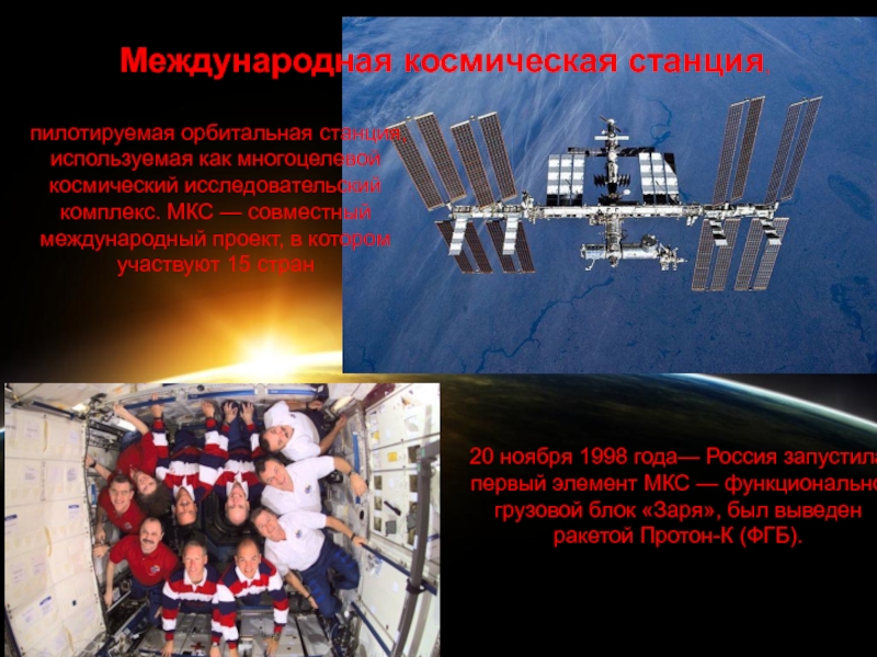 20 ноября 1998 года— Россия запустила первый элемент МКС — функционально-грузовой блок «Заря», был выведен ракетой Протон-К (ФГБ).