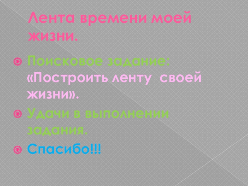 Лента времени моей жизни.Поисковое задание: «Построить ленту своей жизни».Удачи в выполнении задания.Спасибо!!!