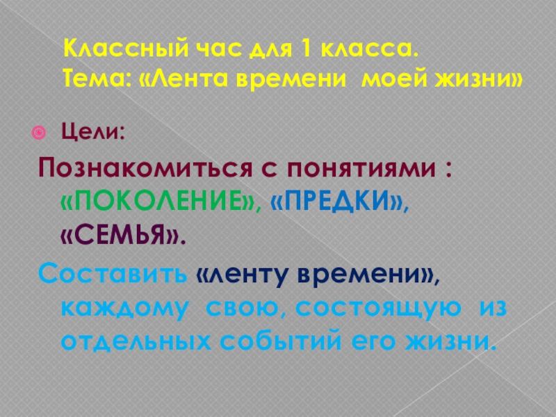 Классный час для 1 класса. Тема: «Лента времени моей жизни»Цели:Познакомиться с понятиями : «ПОКОЛЕНИЕ», «ПРЕДКИ», «СЕМЬЯ».Составить «ленту
