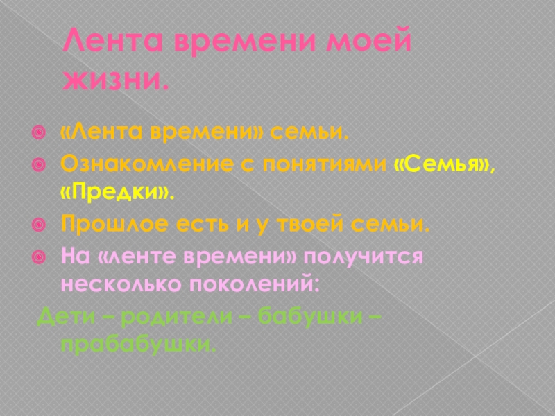 Лента времени моей жизни.«Лента времени» семьи.Ознакомление с понятиями «Семья», «Предки».Прошлое есть и у твоей семьи.На «ленте времени»