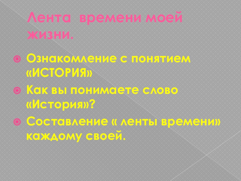 Лента времени моей жизни.Ознакомление с понятием «ИСТОРИЯ»Как вы понимаете слово «История»?Составление « ленты времени» каждому своей.