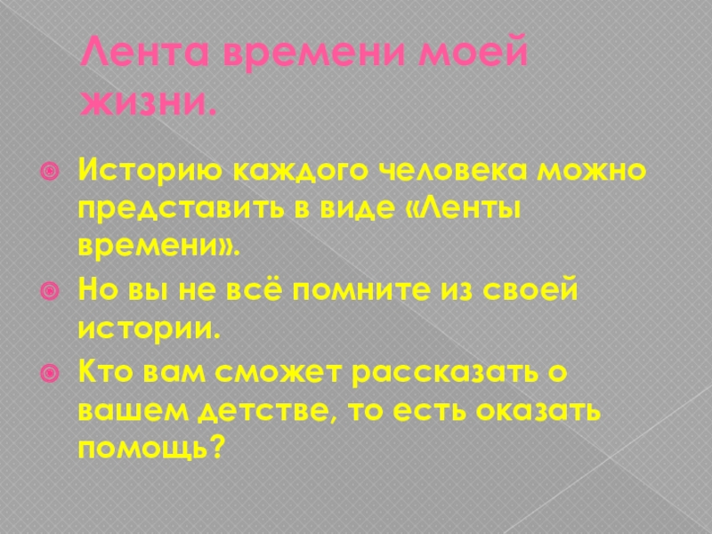 Лента времени моей жизни.Историю каждого человека можно представить в виде «Ленты времени».Но вы не всё помните из