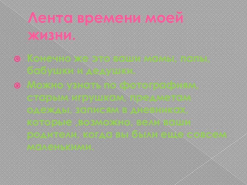 Лента времени моей жизни.Конечно же это ваши мамы, папы, бабушки и дедушки.Можно узнать по фотографиям, старым игрушкам,