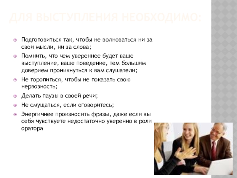 Для выступления необходимо:Подготовиться так, чтобы не волноваться ни за свои мысли, ни за слова;Помнить, что чем увереннее