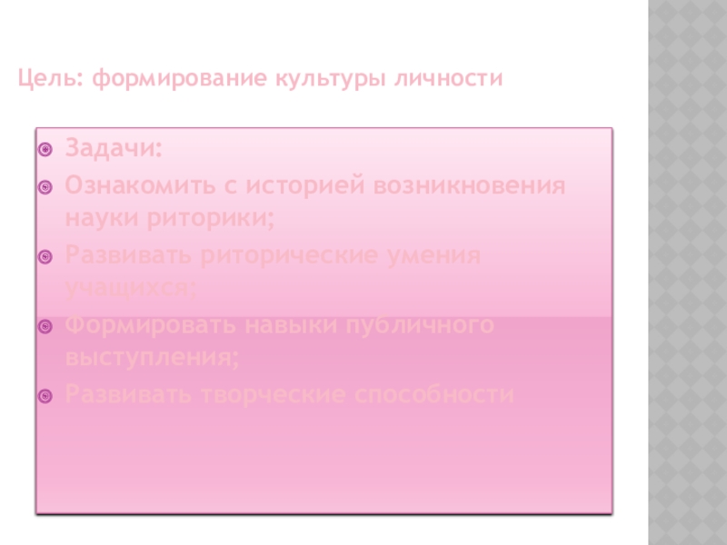 Цель: формирование культуры личностиЗадачи:Ознакомить с историей возникновения науки риторики;Развивать риторические умения учащихся;Формировать навыки публичного выступления;Развивать творческие способности