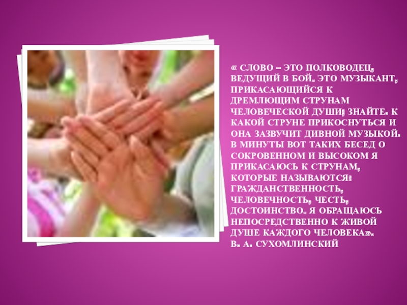 к дремлющим струнам человеческой души; знайте. К какой струне прикоснуться и она зазвучит дивной музыкой. В минуты вот таких бесед о сокровенном и высоком я прикасаюсь к струнам, которые называются: Гражданственность, Человечность, Честь, Достоинство. Я обращаюсь непосредственно к живой душе каждого человека». В. А. Сухомлинский
