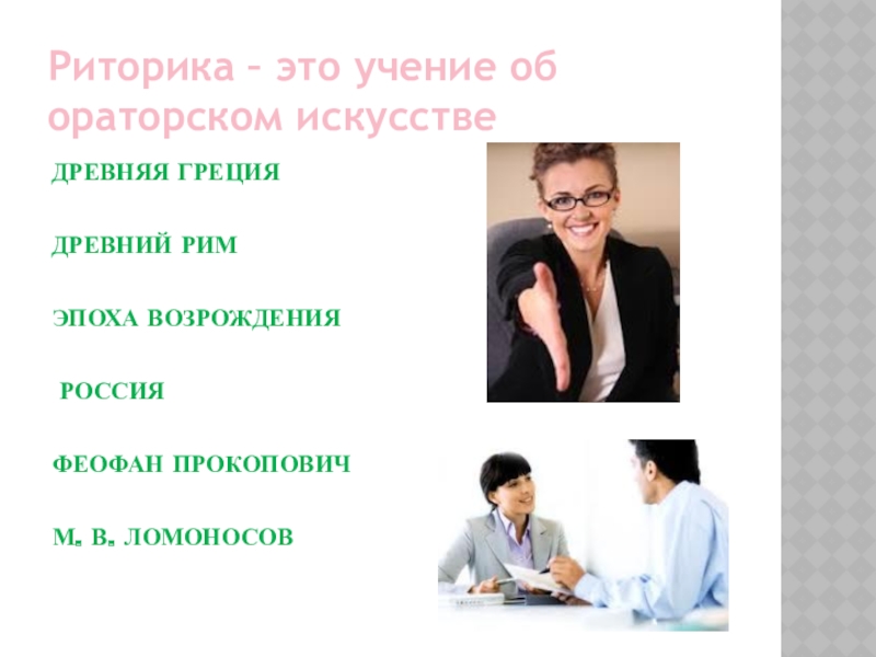 Риторика – это учение об ораторском искусствеДревняя ГрецияДревний Рим Эпоха возрождения РоссияФеофан ПрокоповичМ. В. Ломоносов