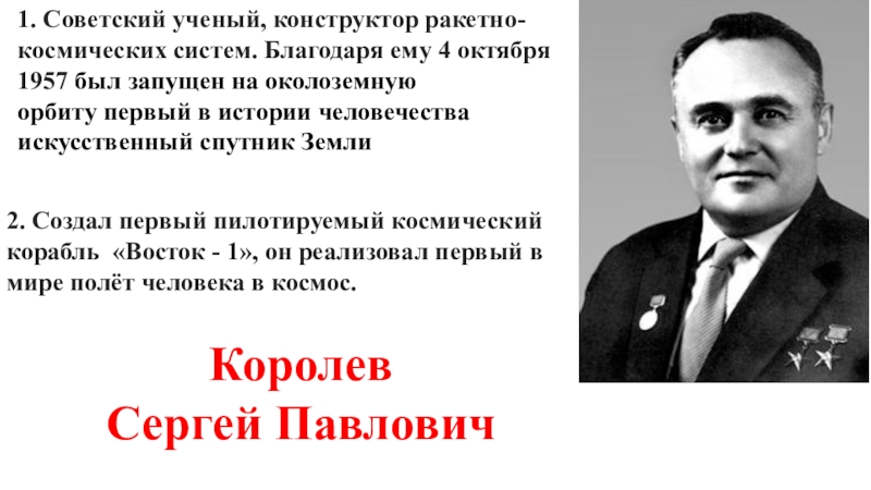 2. Создал первый пилотируемый космический корабль «Восток - 1», он реализовал первый в мире полёт человека в космос.