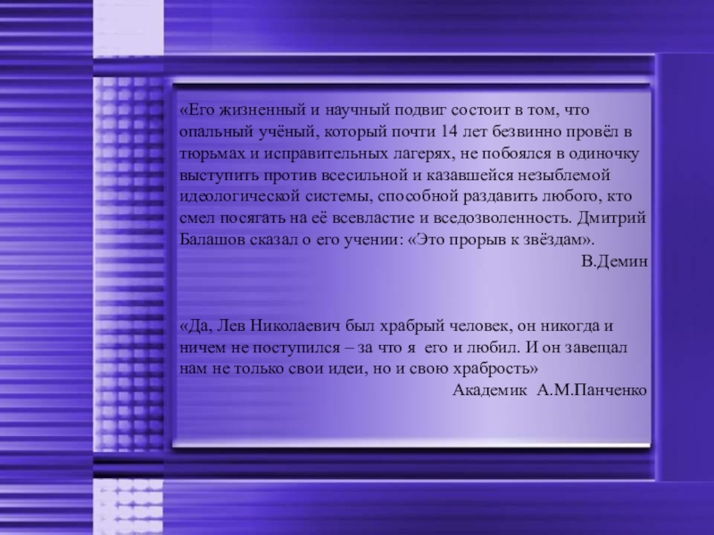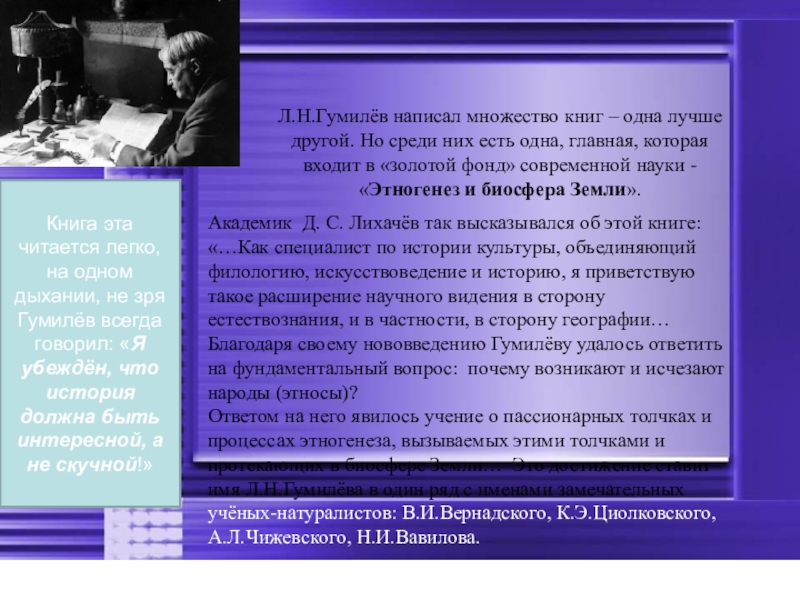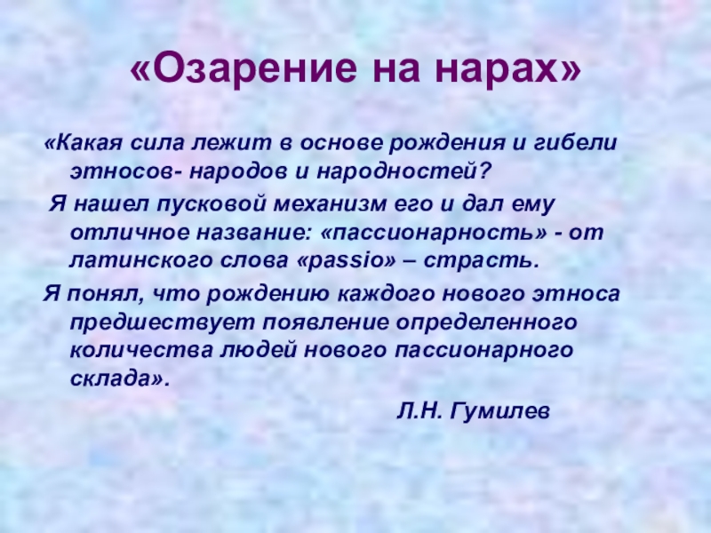 Ответом на него явилось учение о пассионарных толчках и процессах этногенеза, вызываемых этими толчками и протекающих в биосфере Земли… Это достижение ставит имя Л.Н.Гумилёва в один ряд с именами замечательных учёных-натуралистов: В.И.Вернадского, К.Э.Циолковского, А.Л.Чижевского, Н.И.Вавилова.