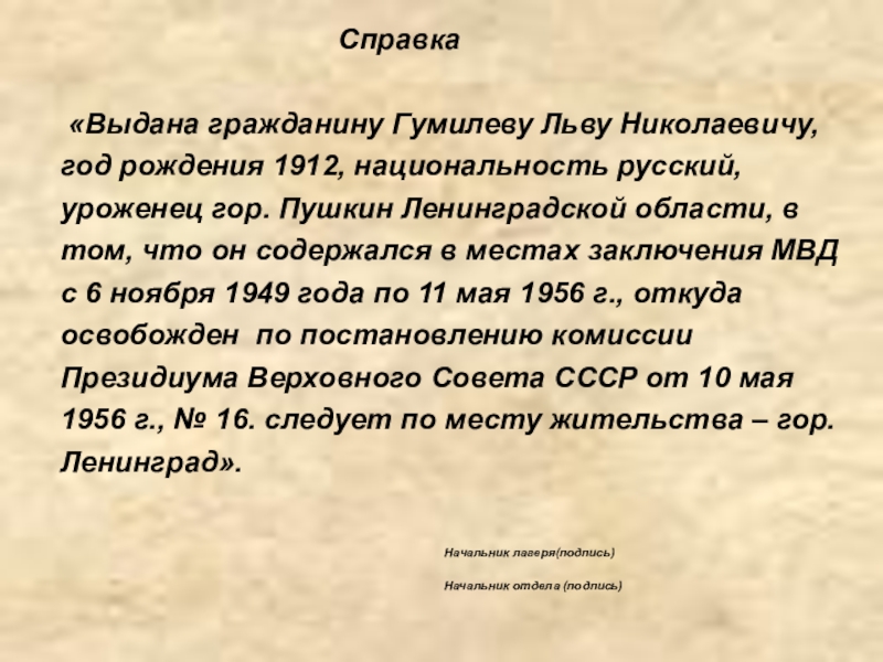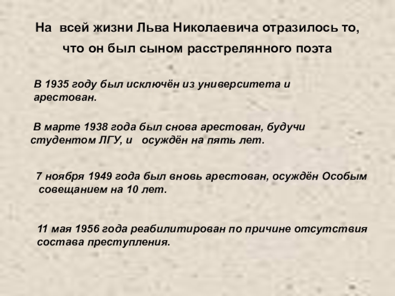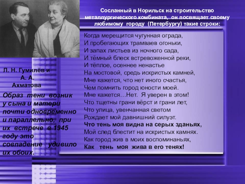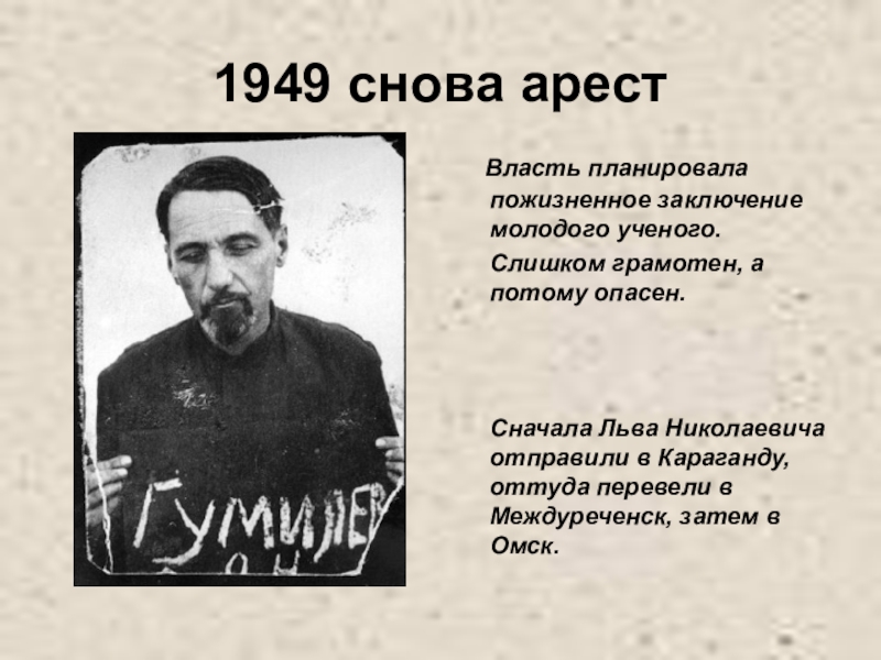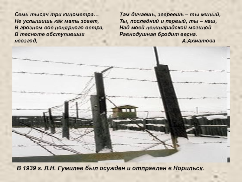 В 1939 г. Л.Н. Гумилев был осужден и отправлен в Норильск.