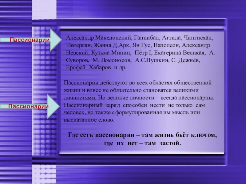 Пассионарии действуют во всех областях общественной жизни и вовсе не обязательно становятся великими личностями. Но великие личности – всегда пассионарны.