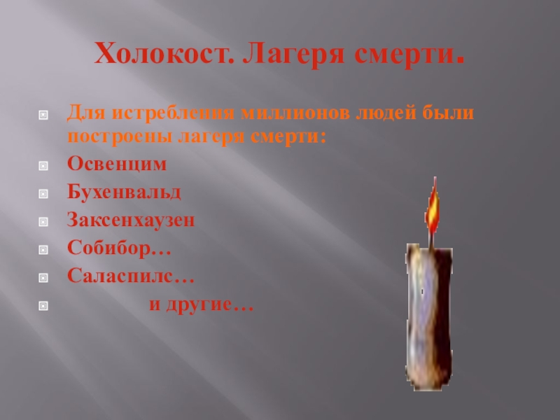 Холокост. Лагеря смерти. Для истребления миллионов людей были построены лагеря смерти:Освенцим Бухенвальд Заксенхаузен Собибор…  Саласпилс…